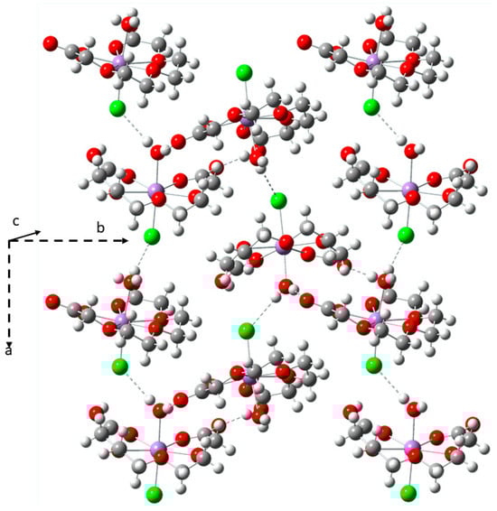 The mono-hydrogenated ligand derivative reacts with Mn(II) cations in a 1:1 ratio, and the corresponding crystal asymmetric unit comprises one discrete complex which is represented in Figure 2. In the crystal packing, the isolated molecules are interconnected by strong H bonds stemming from the two hydrogens of the coordinated water molecule that interact with a chlorine ion and a protonated carboxyl group. The Mn(II) ion shows a pentagonal, bipyramidal coordination with its axial positions occupied by chlorine and water, while the 3,6,9-trioxaundecanedioic acid with one protonated carboxylate lies on the equatorial plane. Its five oxygens (three oxygens from the ether functions, one -CO-O- and one -COH=O) surround the centre of the Mn(II). This similar seven-coordination was already observed with more rigid and pre-organized ligands such as 15-crown-5 ether [46,47,48,49]. The distortion in the equatorial plane of our complex (evidenced by an O1-Mn-O5 angle of around 81.99°, shown in Table S2) when compared to the geometry shown in the 15-crown-5 ether complexes, in which the angle involving two adjacent coordination atoms on the equatorial plane and the central metal ion ranges from around 71 to 73° [46], can be attributed to the looser, more open conformation of 3,6,9-trioxaundecanedioic acid.