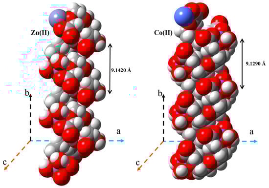 Helical structures of the Co(II) and Zn(II) complexes obtained via SC-XRD; the reported distances describe the respective helix pitches (expressed in Angstrom).