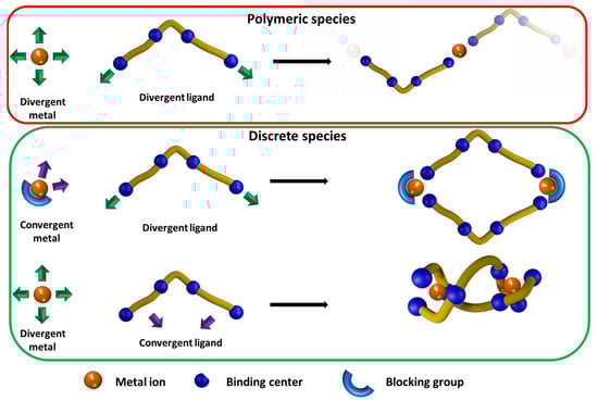 To shed light on the reasons that lead to the differences in shape and crystal packing between the Co(II), Zn(II) and Mn(II) complexes, it is worth pointing out the concepts of host–guest chemistry and divergent/convergent binding sites. Paraphrasing Donald J. Cram, in host–guest chemistry, the host component consists of an organic species in which the binding site converges in the complex. At the same time, the guest consists of a species in which the binding sites diverge in the complex [50]. Within the context of metallo-supramolecular aggregates, Makoto Fujita pointed out that the nature of the output, be it polymeric or discrete, can be successfully predicted by relying on the nature of the building blocks utilised [26,51,52]. Specifically, Fujita’s approach is based on the concept of the divergent/convergent binding sites of both the ligand and the metal ion. As illustrated in Scheme 1, a metallo-supramolecular polymer is obtained only if both the metal ion and the ligand involved possess divergent binding sites (described in the red box in Scheme 1). In the other situations (green box) in which at least one of the ligand and the metal ion or both of them possess convergent binding sites, the self-assembly process results in a discrete supramolecular complex. In this regard, one could call polymeric self-assembly a recessive characteristic.