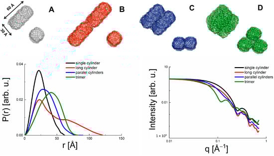 The principle of deriving structural information from SAXS/SANS data is illustrated in Figure 1 by using four model protein systems based on an approximated monomeric cylinder with a diameter of 30 Å and a length of 60 Å. From left to right, a monomer, a long dimer, a compact dimer, and a trimer are constructed from the same basic unit. The resulting P(r) functions calculated from the model systems are shown on the left bottom, the SAXS data calculated from the same model systems on the right bottom of Figure 1. The P(r) function of the monomer has a peak at about 30 Å and extends to a maximum length Dmax of a bit more than 60 Å. The latter values appear to be intuitive for the given monomer structure. It is now instructive to follow the P(r) functions of the other oligomers. The long dimer retains the main peak at 30 Å characterizing the two monomer structures within the dimer, but also exhibits a second distribution of higher radii above a length of 60 Å accounting for the extended dimer structure. The compact dimer, in contrast, has a P(r) function shifted to generally higher values, but not as high as the Dmax-value of the long dimer. This effect becomes even more pronounced for the even bigger compact trimer system. The resulting SAXS data can then be calculated according to Equation (4). Here, the curve of the (smallest) monomer structure is found at the highest q-values, since SAXS data are obtained in the Fourier space. Consequently, the higher-order oligomers (dimers, trimers) appear to be shifted to generally smaller q-values. It is interesting to note that there are subtle differences between long and compact dimer, though, which allow to distinguish their shapes in an experiment.