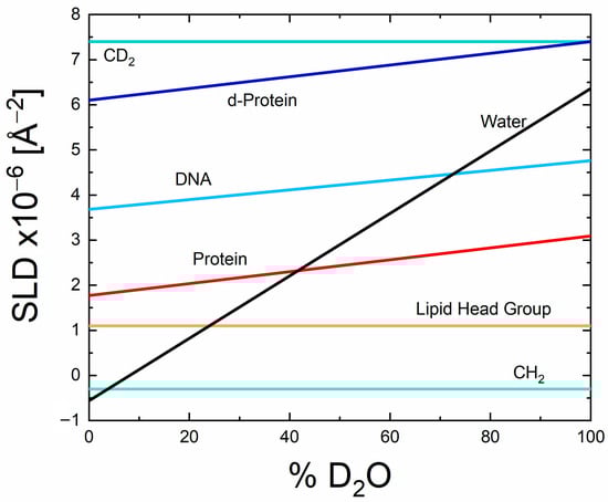 While both SANS and SAXS techniques provide information about size and shape of biomolecules, their nature of interaction with a sample is different. Neutrons interact with the nuclei of a biomolecule, while X-rays get scattered by electrons. Due to the sensitivity of neutrons for different isotopes of the same atom, SANS has the special advantage of contrast variation by isotope exchange, e.g., the replacement of hydrogens by deuterium. Therefore, SANS is a useful tool to study multi-component protein complexes with selective deuterium labeling of individual components. Moreover, SANS is a powerful technique to probe systems containing components with different scattering length densities e.g., lipid (or detergent)-protein systems. The structural information of each individual component can be probed by varying the D2O ratio in the solvent referred to as contrast variation or scattering length density matching. As examples, the match points for lipids/detergents, proteins and nucleic acids are about 5–25%, 40–45% and 65–70% of D2O respectively, see Figure 2 [].