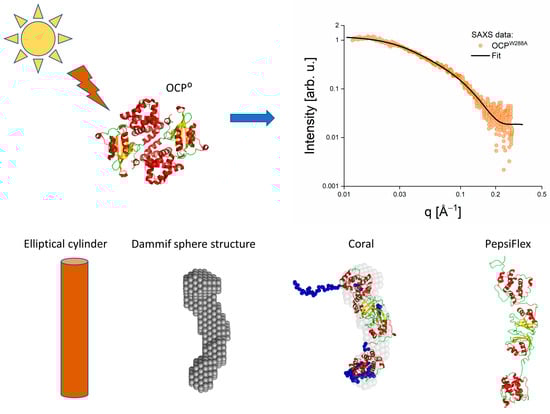 - Golub, M.; Moldenhauer, M.; Schmitt, F.J.; Feoktystov, A.; Mandar, H.; Maksimov, E.; Friedrich, T.; Pieper, J. Solution Structure and Conformational Flexibility in the Active State of the Orange Carotenoid Protein. Part I: Small-Angle Scattering. J. Phys. Chem. B 2019, 123, 9525–9535. [Google Scholar] [CrossRef]