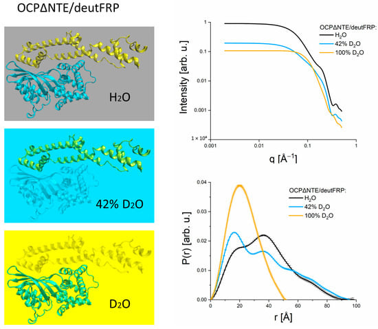 Left panels: Illustration of the principle of contrast matching for the structure of a complex of OCPΔNTE (blue) with deuterated FRP (yellow), structures are reproduced following Golub et al., 2023 []. The different matches achieved at contrasts of 0%, 42% and 100% D2O (from top to bottom) are indicated by different colors. Top, right: SANS data calculated for the complex of OCPΔNTE with deuterated FRP at the different contrasts. Bottom, right: P(r) functions calculated from the SANS data. The color scheme is kept throughout all figure parts.