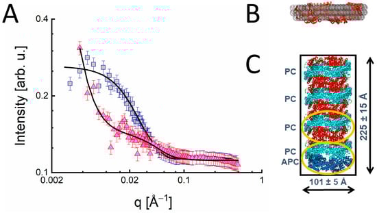 (A) SANS data of PBPs from A. marina, which are dissolved in buffers containing (PBP +P, blue squares) or lacking phosphate (PBP −P, red triangles), respectively. The full black lines are simultaneous fits of both data sets assuming a linear superposition of a cylinder (Equation (4)) and a power law (Equation (3)) accounting for aggregation in the case of PBP −P. (B) The crystal structure of PC from T. elongatus in trimeric form based on PDB code 4Z8K []. The grey spheres show the low-resolution structure of PC obtained using the program DAMMIF from the SAXS data shown in Figure 5. (C) schematic representation of PBPs from A. marina as a cylinder (black rectangle) based on the SANS data of the present study. The crystal structures of seven PC (red and turquoise) trimers (see [], PDB code 4Z8K) and one APC (blue) trimer (see [], pdb code 1B33) are superimposed on the cylinder structure, see text. The approximate sizes of one PC homodimer and one PC/APC heterodimer are indicated by orange ellipses. The images are taken from Golub et al., 2017 [] with permission.