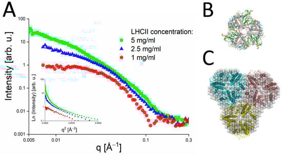 (A) SANS data of LHCII-β-DM complex obtained at different protein concentrations and at a contrast of 100% D2O. Green dots correspond to the measurement at a protein concentration of 5 mg/mL; blue dots—2.5 mg/mL and red dots—1 mg/mL. The inset shows the Guinier plot of the same SANS data. (B) The crystal structure of trimeric LHC II as obtained by Liu et al. []. (C) Structure reconstruction of LHCII–β-DM-sample based on SANS and SAXS data. The grey spherical structure is the reconstruction of the complex using DAMMIN. The images are taken from Golub et al., 2022 [] with permission.