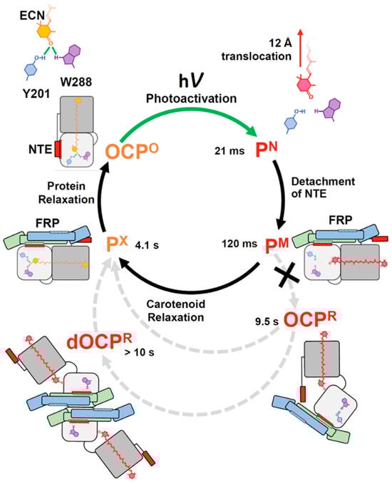 Scheme illustrating the photocycle of OCP when FRP is present, as described by Tsoraev et al. []. The red and orange symbols denote the intermediate states, the time values represent their relaxation times. OCP is represented by white and grey squares corresponding to the CTD and NTD domains, respectively. The chain-like molecule inside of the OCP domains is the carotenoid shown in the color of the specific intermediate. The Figure is reproduced from reference [] with permission.
