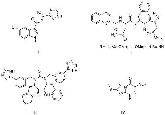 Triazole-, tetrazole-, and quinoline-containing active pharmaceutical ingredients exhibiting antiviral activity: I—viral integrase inhibitor; II, III—HIV protease inhibitors; IV—an inhibitor of viral RNA replication.