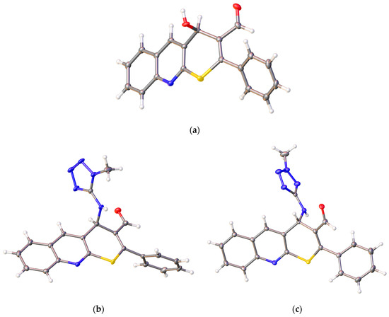 The structure of the target 4-hydroxy-4H-thiopyrano[2,3-b]quinolines was determined using the example of compound 1. The structure of the target tetrazole-containing 4H-thiopyrano[2,3-b]quinolines was determined using the example of compounds 9a and 10a, which have different positions of the substituent in the tetrazole ring. Suitable crystals were studied using an Agilent Technologies “SuperNova” (9a) and Rigaku «XtaLAB Synergy-S» (1, 10a) diffractometers (mono-chromated Cu Kα radiation, λ= 1.54184 Å). The temperature was kept at 100(2) K throughout the experiment. Empirical absorption correction was applied in the CrysAlisPro (Agilent Technologies, 2014; Rigaku OD, 2021) program complex using spherical harmonics, implemented in the SCALE3 ABSPACK scaling algorithm. The structures were solved by the SHELXT [36] program, using least squares minimization in anisotropic (for non-hydrogen atoms) approximation and refining with the SHELXL package [37] incorporated in the Olex2 program package [38]. The hydrogen atoms were introduced to the geometrically calculated positions and refined by attaching themselves to the corresponding parent atoms. The disorder within one independent half of molecule 10a was modeled by the free-populated superposition of two sets of the benzene ring coordinates corresponding to slightly different positions of the ring in space. Crystallographic data for the studied samples have been deposited at Cambridge Crystallographic Data center (1: CCDC 2289287; 9a: CCDC 2271109; 10a: CCDC–2271110).