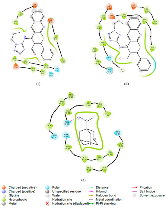 Ligand interaction diagrams for compounds: (a) 7; (b) 8; (c) 9c; (d) 10c; and (e) rimantadine with M2 channel.