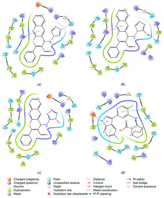 Compounds 7, 8, and 9a, with remarkable affinity to PB2, showed the presence of principal interactions similar to the control compound (Figure 4d). The crucial interactions are: lipophilic interactions with Phe404/325/323, charged Arg355, and Lys376 [35]. Heterocyclic sulfur gives additional electron density, stimulating protein–ligand binding affinity.