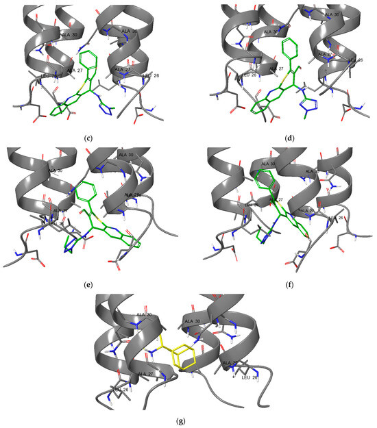Protein–ligand complexes of compounds: (a) 1; (b) 2; (c) 9a; (d) 10a; (e) 9c; (f) 10c; and (g) rimantadine with M2 channel.