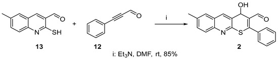 Synthesis of 4-hydroxy-7-methyl-2-phenyl-4H-thiopyrano[2,3-b]quinoline-3-carbaldehyde 2.