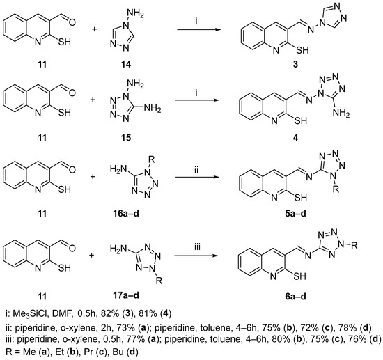 In our further experiments, we explored the thio-Michael/aza-Morita–Baylis–Hillman tandem reaction by using azomethines 3, 4, 5a–d, and 6a–d as substrates. These azomethines were derived from 2-mercaptoquinolin-3-carbaldehyde 11 and various heterocyclic amines 14, 15, 16a–d, and 17a–d (Scheme 4). The azomethines, when using 4H-1,2,4-triazol-4-amine 14 and 1H-tetrazole-1,5-diamine 15, were synthesized in the presence of trimethylchlorosilane as a catalyst in DMF following the procedure [25]. When 1-alkyl and 2-alkyl-5-aminotetrazoles 16a–d and 17a–d were used, the reaction was carried out in boiling xylene or toluene with piperidine as the catalyst, using a Dean–Stark trap [26].