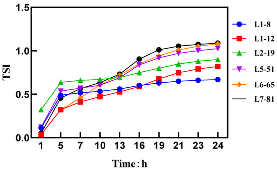 Of the 15 selected samples of different sizes, 6 representative samples (L1–8, L1–12, L2–19, L5–51, L6–65, L7–81), each consisting of 5 mL, were diluted with water to a total volume of 100 mL. Then, 20 mL of the diluted solution was transferred to the measurement sample pool. Near-infrared light (880 nm) was used to perform scans from the bottom (0 mm) to the middle (20 mm) and to the top (45 mm) of the measurement pool. Scans were conducted every 5 min for a total of 24 h at a constant temperature of 30 °C. The measurements provided the intensity of transmitted and backscattered light for each sample, and the Turbiscan Stability Index (TSI) was calculated based on these measurements [29].