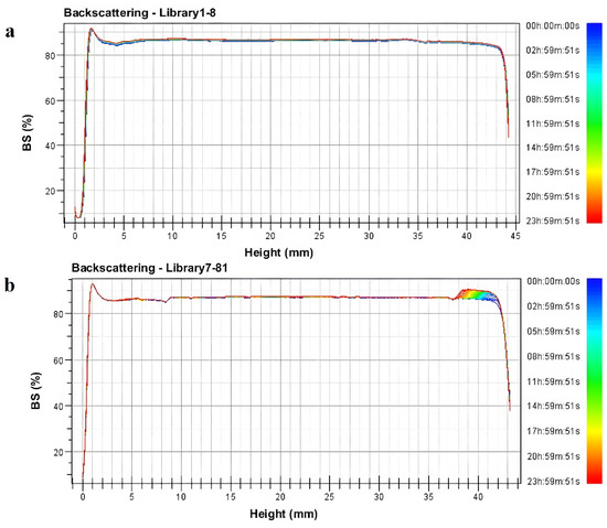 Turbiscan Lab was used to perform scans according to pre-set programs, displaying the spectral profiles of different scan times on the same graph for comparison. As the detection time extended, the backscattered light intensity of the three parts of the sample tube continuously changed to indicate the uniformity of the particle motion. The variation in the curve was used to determine the changes in the system [17].