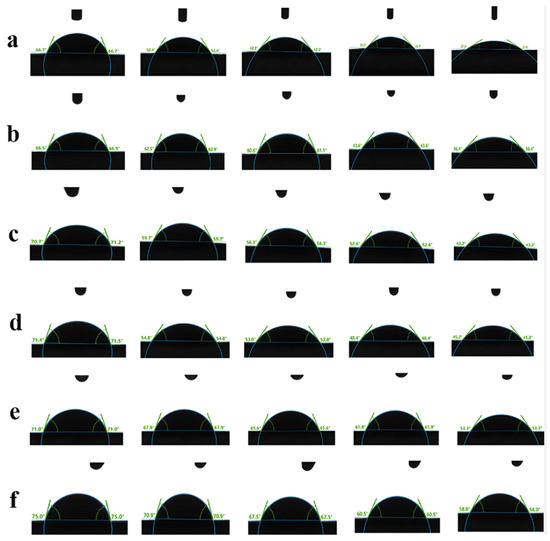 The wetting and spreading process within 10 s: (a) L1–8 sample; (b) L1–12 sample; (c) L2–19 sample; (d) L5–51 sample; (e) L6–65 sample; (f) L7–81 sample.