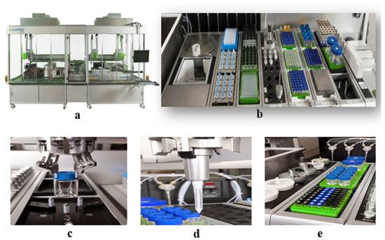 The construction of the HTPS is shown in Figure 6. The equipment includes the following: (a) appearance; (b-1) balance w/side-view camera; (b-2) PDT Rack and waste bin; (b-3) Vortexer mixing module; (b-4) combination hopper and tool rack for holding Powdernium™ Classic and SV hoppers and Dispense Tools for the Multifunctional Arm Element; (b-5) single-cooled position heated/tumbled stir bays; (b-6) capping station; (b-7) high-shear emulsification process; (c) grab samples; (d) liquid measurement; and (e) mixing process.