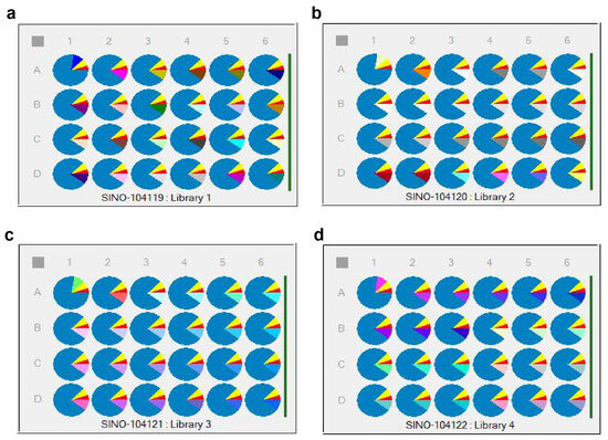 The first component was set as 5% cyetpyrafen (in red), the second component as 7.5% solvent S200 (in yellow), the third component as 10% of 96 different adjuvants (in various colors), and the fourth component as 77.5% water (in blue) [28]. The different unary adjuvant systems were divided into 4 × 6 samples per plate, with a total of 4 plates (Library 1~Library 4), as shown in Figure 7. Specific variables of the parts in various colors are listed in Tables S4–S7.