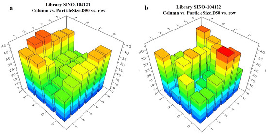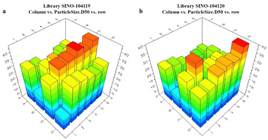 The Helos Quiexl automatic testing program was set up to extractly 1 mL of the prepared pesticide liquid from the HTPS. It was then diluted with water to a total volume of 20 mL. The high-throughput particle size analyzer probe was sequentially inserted into each diluted sample bottle. When the light obscuration remained at 10–20%, the testing process began. The particle size data were obtained using the analyzer software, and the data were sent back to the LEA Library Studio. By comparing different formulations, a comparative analysis of the particle sizes of all samples was performed. The measurement results of the unary are presented in Figure 8 and Figure 9. The ternary systems are presented in Figure S4. The appearance of the formulations was also evaluated using LEA PolyView, as seen in Figure S5.
