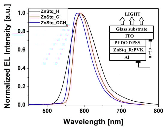 Electroluminescence spectra of ITO/PEDOT:PSS/ZnStq_R:PVK/Al structures. Inset: studied organic light-emitting diode structure.