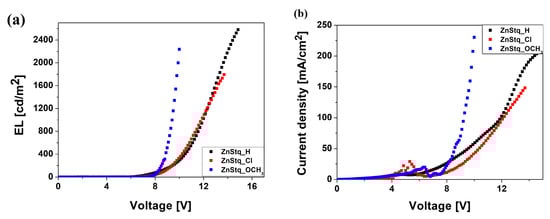 Figure 2a,b present the luminance–voltage and current density–voltage curves recorded for the organic EL devices prepared based on the ZnStq_R:PVK, respectively. The current density–voltage curves show the relationship between the current and voltage from the no-load point to the maximum voltage in the OLEDs. Thus, they show the efficiency of the diodes. The luminance–voltage curves show the relationship between the luminescence intensity and the voltage from the point without luminance to the point with maximum luminosity for a given voltage in the organic light-emitting diodes. Figure 2a presents the luminance–voltage characteristics, which exhibit the features typical for electroluminescent devices. For the studied organic light-emitting diodes, the turn-on voltages (Uon), at which EL becomes detectable [], are 5.38, 5.67 and 6.94 V for the ZnStq_H, ZnStq_Cl and ZnStq_OCH3, respectively. The highest value of the Uon was observed for an electron-donating methoxy group. The values of the threshold voltage (UT), at which the device starts to switch on [], were specified at 6.35, 7.80 and 7.35 V for the ZnStq_H, ZnStq_Cl and ZnStq_OCH3, respectively (see Figure 2b and Table 1). Lim et al. [] obtained Uon values between 6 and 7 V and about 7 V for the UT value for their diode ITO/TPD:PMDA-ODA PI/Znq2/Al, which are close to the values obtained by us for the ZnStq_R-based OLEDs.