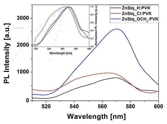 The photoluminescence spectra of the ZnStq_R:PVK thin films on silicon substrates are shown in Figure 3. Thin-film measurements on Si are essential because they allow for independent measurements of the rest of the diode structure. The use of silicon reduces the contribution of reflection from the back layer of the structure, compared to aluminum, which acts as a reflector in the diode; thus, it facilitates the luminescence measurement. From Figure 4, we can observe one broad band with a maximum at 569 nm for the ZnStq_H. For the electron-withdrawing substituent (ZnStq_Cl), we observe a blue shift of the PL peak to 565 nm, and for the electron-donating substituent (ZnStq_OCH3), we observe a red shift to 571 nm. Barberis et al., in their work [], described similar structures with a styryl fragment and obtained the maximum luminescence at 564 nm. From Figure 3, we can additionally note that, in the case of the sample with the methoxy group, the intensity increased twice compared to those of the ZnStq_H and ZnStq_Cl samples.