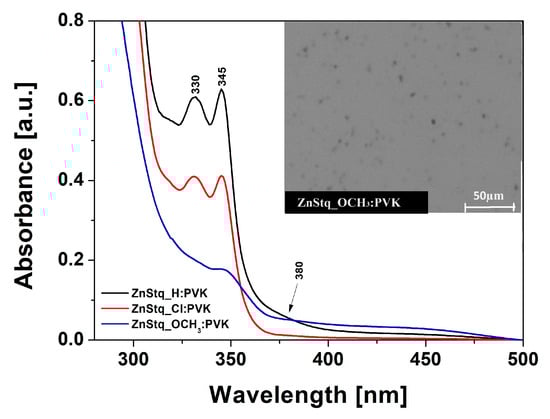 Figure 4 shows the absorption spectra of the ZnStq_R:PVK thin films deposited on glass substrates, in which bands at 315–321 nm attributed to π–π* [], at 330 nm and 345–348 nm attributed to the π–π* bonding of the 8-hydroxyquinoline unit and at 380 nm for the ZnStq_R corresponding to the π–π* transition of the styrylquinoline unit can be observed []. Two bands at 330 and 345 nm are visible for the ZnStq_H and ZnStq_Cl. In the case of the ZnStq_OCH3, the band disappears at 330 nm, and the second band shifts to 348 nm.