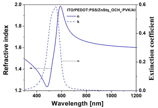 Dependence of refractive index (n) and extinction coefficient (k) on wavelength for ZnStq_OCH3:PVK layer in the ITO/PEDOT:PSS/ZnStq_OCH3:PVK/Al structure.