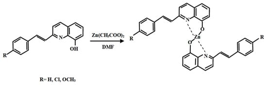 The ligands of Stq_H, Stq_OCH3 and Stq_Cl were synthesized via the reaction of condensation-corresponding benzaldehydes and 2-methyl-8-quinolinol. The experimental procedure has been described elsewhere []. The Zn-containing complexes were prepared via reaction with corresponding Stq compounds and Zn(CH3COO)2 in DMF solution with a mole ratio of 2:1. The synthetic route and chemical structure for ZnStq complexes are shown in Figure 7.