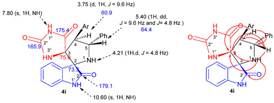 The structure, the purity and the relative configuration of all products were elucidated from their 1D and 2D NMR spectroscopic data and were unequivocally confirmed by an X-ray data analysis performed on cycloadduct 4i. Relevant 1H and 13C chemical shifts of dispiropyrrolidine 4i are shown in Figure 2.