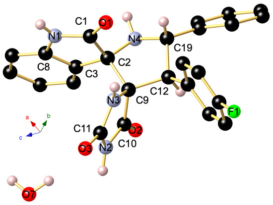 The regio- and stereochemistry of the 1,3-dipolar cycloaddition was further corroborated by a single-crystal X-ray analysis of spiropyrrolidine 4i, whose molecular structure is depicted in Figure 3. It reveals that the carbonyl carbon of the oxindole component and (i) carbonyl group of hydantoin part (C-10 in the crystal structure) are in trans-relationship, and (ii) a cis -relationship with H-5 pyrrolidinyl proton bonded to C-5 (C-19 in the crystal structure).