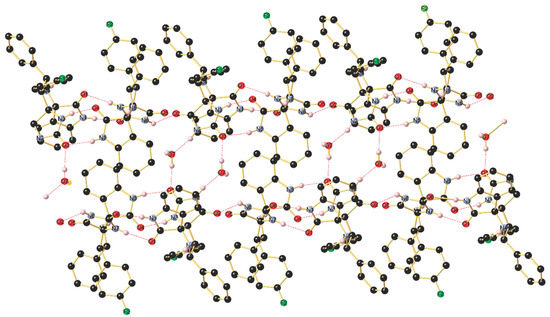 The asymmetric unit of 4i shown in Figure S30 contains two independent molecules (with slightly different bond lengths and angles), crystallizing in the triclinic space group P-1, along with H2O molecules. The stereochemistry of the tetracyclic core bearing two additional aryl groups at C19 and C12 is in the solid state in line with the NMR data in solution and establishes the transoid arrangement of two the hydrogen atoms of the pyrrolidine-type five-membered cycle. As visualized in Figure S30, the two independent molecules are mutually associated through a strong intermolecular N–H···O=C hydrogen bonding occurring between N1–H1 and O6 with (d(N1-H1···O6) 1.96(2) Å), the N1–H1···O6 angle being 173(2)°. Furthermore, a second intermolecular hydrogen bond is formed between N3–H3 and O4 (d(N5–H5···O5) 2.05(2) Å), The thus generated supramolecular 1D ribbon displays a third somewhat weaker N–H···O=C bonding between N7–H7 and O1 (d(N7–H7···O1) 2.13(2) Å) with a N7–H7···O1 angle being 169.4(19)° as well as a forth interaction between N6–H6 and O23 (d(N6–H6···O2) 2.11(2) Å). In addition, the co-crystalized H2O molecule interconnects two ribbons through O–H···O bonding with O3 (d(O7–H7B···O3) 1.87(3) Å) and N–H···O3 bonding (d(N2–H2···O7) 1.88(2) Å). Finally, a weak intermolecular C–H···F1 contact (d(C2–H15···F2) 2.49 Å) completes the supramolecular interactions occurring in this highly organized network (Figure 4).