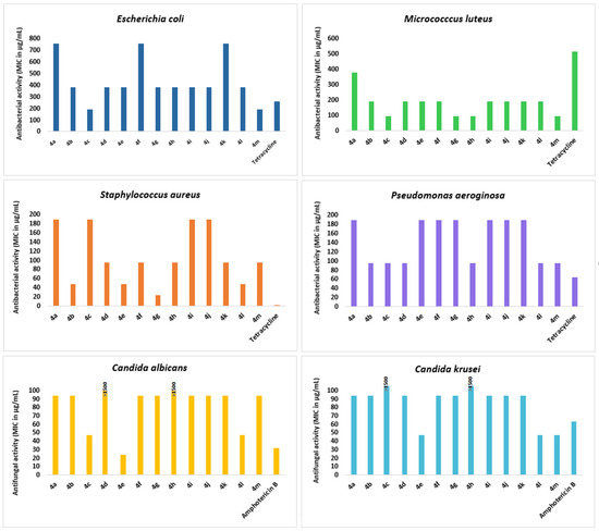 Tetracycline was used as reference drug for the antibacterial assay while Amphotericin B was used as a standard antifungal drug. The results are summarized in the histograms presented in Figure 6.