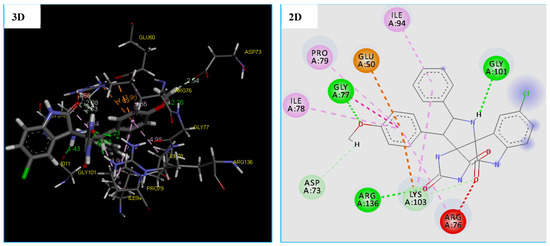 Furthermore, the compound 4c proved a good ability to the binding into DNA Gyrase binding site and this is confirmed by forming 6 strong hydrogen bonding interactions with Gly 101(1.43 Å), Arg 136(2.63 Å and 2.23 Å), Gly 77(2.26 Å), and Lys 103(1.86 Å). As shown from the obtained data compound, 4c was able to form 6 hydrophobic interactions with different amino acids in the DNA Gyrase binding pocket which are ARG76, LYS103, ILE94, PRO79, ILE78, and GLY77. In addition, the compound 4c showed two electrostatic interactions (Pi-Anion and Pi-Cation) with GLU50 and LYS103, as displayed by orange dotted lines in Figure 9 for compound 4c (Table 7 and Figure 8).