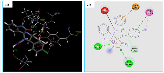 Compound 4g displayed five strong hydrogen bonds (two Conventional H-Bond types and three Carbon H-Bond types) with crucial residues: ARG36 (1.74 Å), GLU37 (2.26 Å), PRO38 (2.12 Å) and ARG48 (2.73 and 3.05 Å) of TMK protein from S. aureus (Table 7 and Figure 6). As illustrated in Figure 6, two 6-rings of the compound 4g displayed two hydrophobic interactions (Pi–Pi T-shaped) with the residues PHE66 and TYR100. In addition, two other hydrophobic interactions (Pi-Pi Stacked) were formed between compound 4g and residue PHE66. While four hydrophobic interactions (Pi-Alkyl) with active site residues: ARG36, ILE47, ARG48 and VAL51 (Table 7 and Figure 6). We note that these results confirmed by previous studies [61,62,63] which concluded that inhibition of the both amino groups: ARG48, PHE66 and GLU37 of TMK protein might be responsible for their potent antibacterial activity.