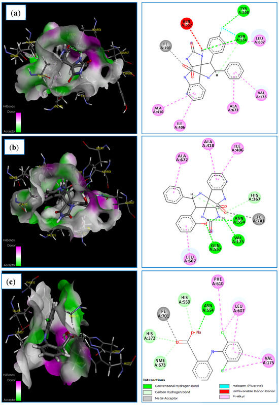 In an attempt to rationalize the observed bioactivity for the newly synthesized derivatives, molecular docking studies were performed. The most antibacterial spirooxindole-hydantoins, i.e., 4c, 4g, and 4h were docked into the active site of three bacterial targets: Thymidylate Kinase (TMK) (PDB ID 4QGG) from S. aureus, (3-oxoacyl-[acyl-carrier-protein) synthase 3 (PDB ID 4EWP) from M. luteus, DNA gyrase (PDB ID 4DUH) from E. coli. The ligand 4e was docked to the target secreted aspartic protease (PDB ID 3Q70) from C. albicans and C. krusei. The Ligands 4i and 4l with the most promising ant-inflammatory potential were docked into the active sites of LOX-5 (PDB ID: 3V99). The PDB binding structures of different target enzymes are presented in Figures S31–S42 of the Supplementary Material.