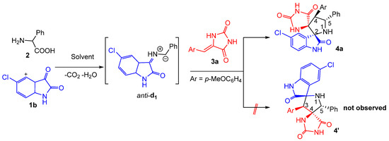 Accordingly, we propose that spirooxindole-hydantoins 4 are formed through an endo-approach between the (Z)-5-arylideneimidazolidine-2,4-diones 3 and the in situ generated (Z,E)-dipole d1, as outlined above in Scheme 1 and Scheme 2.