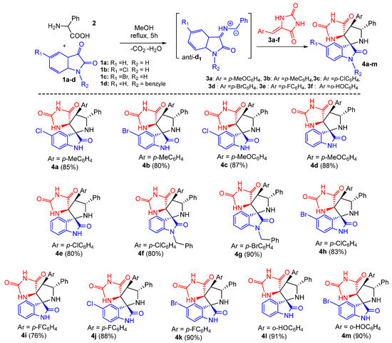 Subsequently, the generality of the one pot reaction was examined using several substituted dipolarophiles 3a–f and isatins 1a–d, resulting in the synthesis of diversely substituted products 4a–m in good yields and with high regio- and stereoselectivity (Scheme 2). As shown in Scheme 2, the multicomponent reaction appears to be tolerant towards both electron-donating and electron-withdrawing groups at the para position of the aromatic ring of arylidene hydantoins 3, thereby affording the corresponding products 4a–m in 80–91% yield range (Scheme 2). The system also proceeded well with halogen substituents at the aromatic ring of isatin such as chloro (1b) and bromo (1c), providing the desired dispiro[imidazolidine-4,3′-pyrrolidine-2′,3″-indoline]-2,2″,5-triones 4 in 76−91% isolated yields (Scheme 2). Furthermore, N-protected isatin 1d was compatible with the reaction.