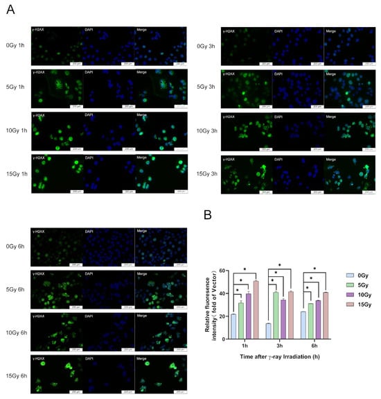 Based on the research of Wang (0, 2.5, 5, 10, 20 and 40 Gy; 6, 24, 48, 72 and 96 h) [39] and Lee et al. (0, 5 and 10 Gy) [17] and previous studies in our laboratory, in this study, we chose three irradiation doses—low (5 Gy), medium (10 Gy), and high (15 Gy)—to analyze the extent of DNA damage using a γ-H2AX immunofluorescence assay to determine the appropriate model for irradiation-injured cells. The results showed that γ-H2AX protein was substantially upregulated in HaCaT cells at 1, 3, and 6 h after 5, 10, and 15 Gy irradiation exposure, respectively (Figure 2A,B). At 1 and 6 h after irradiation, with increasing irradiation doses, γ-H2AX protein expression dose-dependently increased (Figure 2A,B). However, with the prolongation of the irradiation time, the protein expression of γ-H2AX was gradually downregulated (Figure 2A,B). When the irradiation dose was 5 Gy, the most significant increase in γ-H2AX protein expression was observed at 3 h (Figure 2A,B). In this study, we demonstrated that irradiation induces DNA damage. DNA damage in HaCaT cells occurs within a short time after irradiation (Figure 2A,B).
