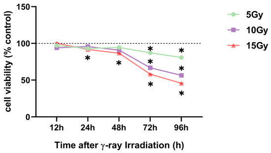 γ-ray irradiation-induced inhibition of human keratinocyte (HaCaT) cell proliferation. Summary data showing HaCaT proliferation as assessed using CCK-8 assays 12, 24, 48, 72, and 96 h after HaCaT cells were unexposed (0 Gy) and exposed (5, 10, and 15 Gy) to γ-ray irradiation. Data are shown as the mean ± SEM (n = 30) of three independent experiments, * p < 0.05, which were analyzed using two-way analysis of variance followed by Tukey’s multiple comparisons test.