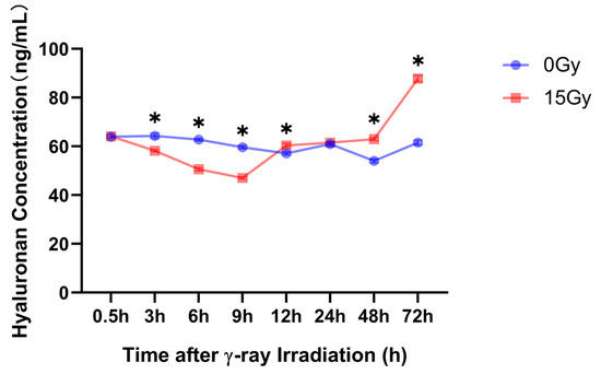 The skin contains most of the body’s high-molecular-weight HA, which has numerous functions in the skin [40]. Herein, we used an enzyme-linked immunosorbent assay (ELISA) to detect the low-molecular-weight HA concentrations at 0.5, 3, 6, 9, 12, 24, 48, and 72 h after 15 Gy irradiation. The results revealed that with 12 h as the threshold after 15 Gy irradiation, the HA concentration in the supernatant of the cells significantly decreased within 12 h after radiation and was significantly upregulated after 12 h (Figure 5).