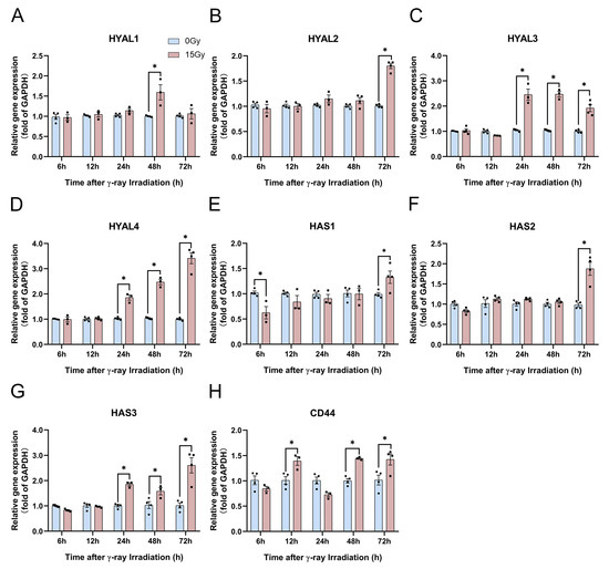 Based on this research theory, we analyzed the gene expression of HA synthesis and degradation enzymes at 6, 12, 24, 48, and 72 h following 15 Gy irradiation using real-time quantitative polymerase chain reaction (PCR). The results revealed no significant effect on the expression of various HA-related metabolic enzyme genes within 12 h following irradiation. Only HAS1 exhibited a significant inhibitory effect (Figure 6A–G). However, HYAL3, HYAL4, and HAS3 were significantly upregulated after 24 h of irradiation (Figure 6C,D,G). HAS2 and HYAL2 are reportedly the main enzymes that play a role in HA synthesis and degradation in the human body [41]. Herein, HAS2 and HYAL2 gene expression levels were significantly enhanced at 72 h after 15 Gy irradiation (Figure 6B,F). Herein, the CD44 gene expression levels were nonsignificant at 6 and 24 h but were significantly enhanced at 12, 48, and 72 h (Figure 6H). These results indicate that HA-related metabolic enzymes and their receptors were significantly enhanced at 48 h and in the late stages of irradiation exposure.
