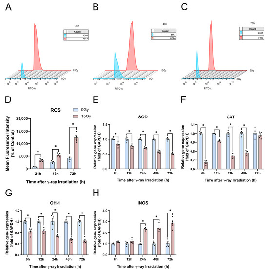 Then, we further investigated the potential mechanisms of ROS production. We found that sodium dismutase (SOD) and OH-1 gene expression were significantly suppressed at 6, 12, 24, 48, and 72 h after irradiation (Figure 8E,G). SOD and OH-1 expression were extremely sensitive to irradiation, showing dose- and time-dependent irradiation (Figure 8E,G). The catalase (CAT) content decreased significantly at 6, 12, 24, and 48 h, and the CAT content gene expression was upregulated after irradiation (Figure 8F). At 24, 48, and 72 h after irradiation, ROS production was significantly upregulated, and the expression of antioxidant genes such as CAT, OH-1, and SOD was significantly inhibited. And iNOS gene expression was significantly increased, which increased NO synthesis and thus aggravated oxidative stress injury (Figure 8D–H). These results indicate that irradiation can induce significant ROS production and significantly upregulate the genes involved in the oxidative stress expression of OH-1, CAT, and SOD.