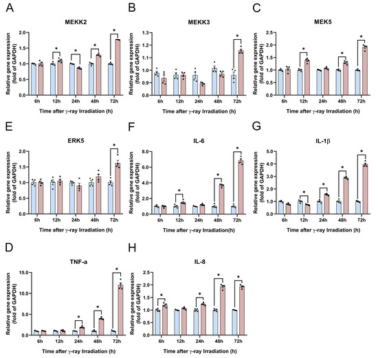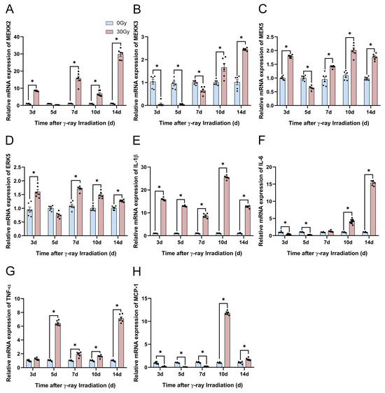 γ-ray irradiation affected the gene expression of inflammatory factors in C57BL/6J mice. (A–H) Gene expression levels of MEKK2, MEKK3, MEK5, ERK5, IL-1β, IL-6, TNF-α, and MCP-1 in C57BL/6J mice that were unexposed (0 Gy) and exposed (30 Gy) after 3, 5, 7, 10, and 14 d of γ-ray irradiation assessed using qRT-PCR assays. Data are shown as the mean ± SEM (n = 6) of three independent experiments, * p < 0.05, which were analyzed using two-way analysis of variance followed by Sidak’s multiple comparisons test. The circular points refer to the data unexposed and square points refer to the data exposed (30 Gy) from multiple repeated experiments.
