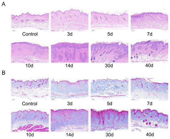 According to clinical high-dose-rate brachytherapy for malignant facial skin lesions with a cumulative radiation dose of 30 Gy [42], a preclinical model of RISI in mice has been proposed in the literature. Based on our knowledge of the effects of different doses of γ-rays on the skin, Mao et al.’s study on the dose of 30 Gy radiation was combined with our research platform in the laboratory to establish a RISI model in 30 Gy mice [43]. We chose 30 Gy irradiation to develop a hemi-body/partial body irradiation (PBI) model by exposing only the abdomen and lower extremities to study RISI and the effects of HA degradation and its mechanism. First, we used HE and Masson staining to detect epithelial thickening and collagen deposition in the skin tissue after 30 Gy irradiation. In this study, the enrichment of dermal tissue and progressive deposition of collagen were observed after irradiation. In the control group, the epidermis was intact, the structure was clear, the dermis was rich in collagen fibers, and the hair follicles and their accessory structures were normal. After 3, 5, 7, and 10 d of irradiation, the epidermis was mildly thickened, epidermal epithelial cells were mildly hyperplastic, and dermal hair follicles and their appendages showed no significant changes. After 30 d of irradiation, the epidermis thickened, the stratum corneum was hyperkeratinized, the number of epidermal epithelial cells increased, and the dermis had localized follicular necrosis and infiltration of inflammatory cells. After 40 d of irradiation, localized ulcers appeared in the epidermis and involved the dermis (Figure 10A). Masson staining showed that the dermal collagen fiber layer in the irradiation group was thicker than that in the normal dermal tissue, and relatively thin dermis and small hair follicles were observed in the control group (Figure 10B). Epidermal thickness increased and dermal collagen deposition increased after 14 d of irradiation compared with unirradiated controls. After 14 d of irradiation, the injured skin gradually recovered, epidermal thickness reduced, and dermal collagen area decreased (Figure 10C,D). These results indicate the successful modeling of localized RISI.
