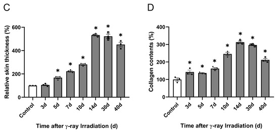 Effects of γ-ray irradiation on skin histopathology in C57BL/6J mice. (A,B) Representative images of HE and Masson staining in γ-ray-irradiated C57BL/6J mice’s skin tissues. (C,D) Quantification of the epidermal thickness (n = 3) and relative collagen area (%) (n = 3) in the experimental groups at different timepoints is shown for C57BL/6J mice that were unexposed (0 Gy) and exposed (30 Gy) after 3, 5, 7, 10, 14, 30, and 40 d of γ-ray irradiation. Data are shown as the mean ± SEM (n = 3) of three independent experiments, * p < 0.05, which were analyzed using one-way analysis of variance followed by Dunnett’s multiple comparisons test. The circular points refer to the data unexposed and square points refer to the data exposed (30 Gy) from multiple repeated experiments.