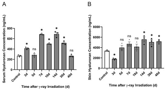 γ-ray irradiation affected the serum and skin HA content in C57BL/6J mice. (A,B) The levels of HA content in C57BL/6J mice that were unexposed (0 Gy) and exposed (15 Gy) after 3, 5, 7, 10, 14, 30, and 40 d of γ-ray irradiation assessed using ELISA. (A) Serum HA content. (B) Skin HA content. Data are shown as the mean ± SEM (n = 3) of three independent experiments, * p < 0.05, ns refers to not significant, which were analyzed using one-way analysis of variance followed by Dunnett’s multiple comparisons test. he circular points refer to the data unexposed and square points refer to the data exposed (30 Gy) from multiple repeated experiments.