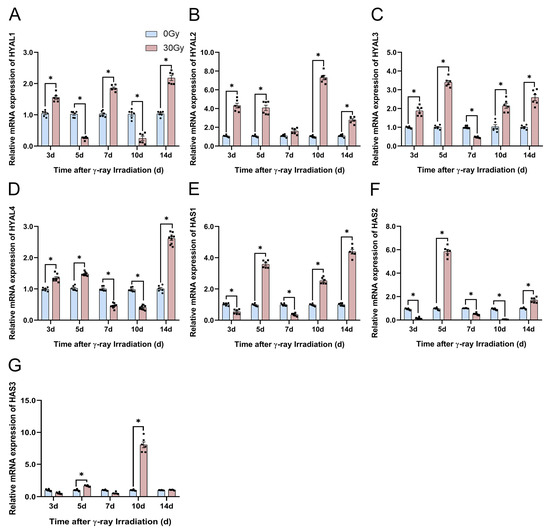 γ-ray irradiation affected the gene expression of HA-related metabolic enzymes in C57BL/6J mice. (A–G) Gene expression levels of HYAL1, HYAL2, HYAL3, HYAL4, HAS1, HAS2, and HAS3 in C57BL/6J mice that were unexposed (0 Gy) and exposed (30 Gy) after 3, 5, 7, 10, and 14 d of γ-ray irradiation assessed using qRT-PCR assays. Data are shown as the mean ± SEM (n = 6) of three independent experiments, * p < 0.05, which were analyzed using two-way analysis of variance followed by Sidak’s multiple comparisons test. The circular points refer to the data unexposed and square points refer to the data exposed (30 Gy) from multiple repeated experiments.