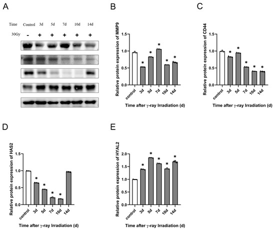 From the foregoing study with qRT-PCR assays, it is clear that γ-ray irradiation can significantly affect the gene expression of HYAL2 and HAS2. We know that HYAL2, CD44, and HAS2 are important for HA degradation’s effect on HA concentration. Thus, we needed to detect the HA-related metabolic enzyme protein expression using a Western blotting assay after γ-ray irradiation. We discovered that CD44 protein expression decreased significantly at 3, 7, 10, and 14 d. Also, irradiation significantly stimulated CD44 protein enhancement at 5 d (Figure 14C). HAS2 is an essential HA synthase that decreased significantly at 3, 5, 7, and 10 d, and HAS2 protein expression gradually reverted to normal levels at 40 d of irradiation (Figure 14D). Then, we also detected the HA-degrading enzyme protein expression of HYAL2. Irradiation upregulated HYAL2 significantly for 2 weeks after irradiation (Figure 14E). Finally, we analyzed the protein expression of MMP-9 and found that MMP-9 gradually upregulated within 1 week after irradiation, with the highest expression on the 7th day, and then it was gradually downregulated after 7 d of radiation, showing significant inhibitory activities (Figure 14B). These results suggest that HA-related metabolic enzymes affect low-molecular-weight HA concentration in RISI C57BL/6J mice.