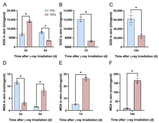 To further verify the modeling of RISI in C57BL/6J mice, we found that numerous studies have demonstrated that PBI can induce mouse body weight loss, severely affect the hematopoietic system, and scatter irradiation to body parts such as the spleen and sternum [44]. Therefore, we used physiological indices to prove the modeling of RISI in C57BL/6J mice. Herein, we found that the body weight and marrow DNA concentration of C57BL/6J mice significantly decreased within 14 d of irradiation. After 14 d of irradiation, the values of both the indices were upregulated and returned to normal (Figure 11A,B). Then, we detected the thymus and spleen indices, which significantly reduced within 10 d of irradiation. Furthermore, organ hypertrophy appeared in mice at 14 d of irradiation, followed by a decrease in the organ index after 14 d of irradiation (Figure 11C,D). Subsequently, we examined the gene expression levels of TGF-β1 and collagen in skin tissue and found that TGF-β1 and collagen genes were significantly upregulated 3, 5, 7, 10, and 14 d after 30 Gy irradiation (Figure 11E,F). These results indicate the successful modeling of RISI in C57BL/6J mice. Consequently, we selected a localized irradiation dose of 30 Gy to establish the RISI mouse model.
